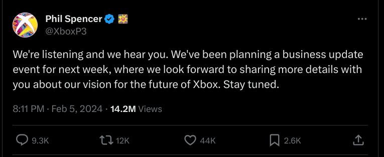Xbox chief and self-proclaimed gamer, Phil Spencer, was quick to put an announcement on Twitter/X, see below: